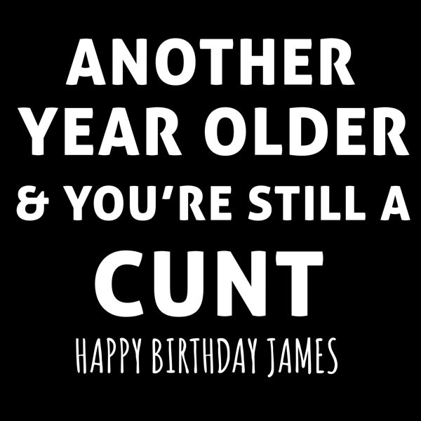 You are in: Home / Products / Cards / Rude n' Crude Personalised Cards / Birthday Birthday Personalised Card - Attention Seeking Personalised Birthday Card for the attention seeker in your life! Just click on the image and add the name you want. These cards are left blank inside for your own message Personalised Card - Another Year Older Personalised Humorous Birthday Card with a name of your choice. This'll give your mates a laugh! Personalised Card - Another Year Older Personalised Humorous Birthday Card with a name of your choice. This'll give your mates a laugh! Personalised Card - Another Year Older Personalised Humorous Birthday Card with a name of your choice. This'll give your mates a laugh! Personalised Card - Bad Person Personalised Humorous Birthday Card with a name of your choice. This'll give your mates a laugh! Personalised Card - Blowjob Voucher Personalised Humorous Birthday Card with a name of your choice. This'll give your mates a laugh! Personalised Card - Fave Gay Friend Personalised Humorous Friend Birthday Card with a name of your choice. Personalised Card -Fave Rug Muncher Personalised Humorous Friend Birthday Card with a name of your choice. Personalised Card - Cabulous Funt Personalised Humorous Friend Birthday Card with a name of your choice. This'll give your mates a laugh. Personalised Card - Favourite Ginger Personalised Humorous Friend Birthday Card with a name of your choice. This'll give your mates a laugh. Personalised Card - Shit I Forgot Your Birthday Personalised Humorous Friend Birthday Card with a name of your choice. This'll give your mates a laugh. Personalised Card - Garage Birthday Personalised Humorous Friend Birthday Card with a name of your choice. This'll give your mates a laugh. Personalised Card - Happy Birthday Personalised Humorous Friend Birthday Card with a name of your choice. This'll give your mates a laugh. Personalised Card - From The Cat Personalised Humorous Card From The Cat. Personalised Card - Happy Birthday Slag Personalised Humorous Friend Birthday Card with a name of your choice. This'll give your mates a laugh. Personalised Card - How Lucky Are You Personalised Humorous Friend Birthday Card with a name of your choice. This'll give your mates a laugh. Personalised Card - OMG Birthday Card Personalised Humorous Friend Birthday Card with a name of your choice. This'll give your mates a laugh. Personalised Card -Step Parent Birthday Personalised Humorous Step-Parent Birthday Card with a name of your choice. Personalised Card - Still Alive Personalised Humorous Birthday Card with a name of your choice. This'll give your mates a laugh. Personalised Card - Only Twats Born In Novemebr Personalised Humorous Birthday Card with a name of your choice. This'll give your mates a laugh. Personalised Card - Let Me Lick Your Face Personalised Humorous Birthday Card with a name of your choice. This'll give your mates a laugh.