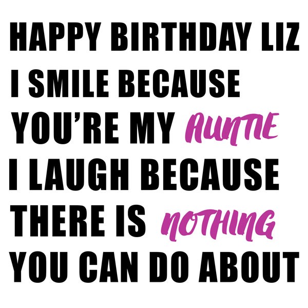 You are in: Home / Products / Cards / Rude n' Crude Personalised Cards / Female Relation Female Relation Humorous Sister Card Humorous Sister Birthday Card. Humorous Mum Birthday Card Humorous Mum Birthday Card with a name of your choice. Personalised Card - Birthday Auntie Personalised Humorous Auntie Birthday Card with a name of your choice.