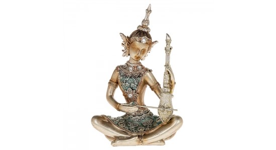 Zen Blue Buddha Playing Lute. A stylish zen Buddha figurine decorated with silvery gold clothing with blue highlights. Sitting crossed legged and playing a lute instrument. Measures approx. 22 cm x 14 cm.