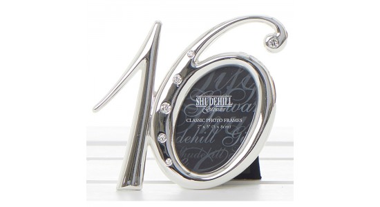 Silver finished number 16 shaped photo frame with 6 diamante jewels. Holds a 2 x 5" portrait photograph.