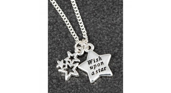 Hanging from a silver chain, the necklace features a charm made up of three stars, two of them hollow. Along with this is a star shaped disc that reads, ‘Wish upon a star' in black, cursive writing.